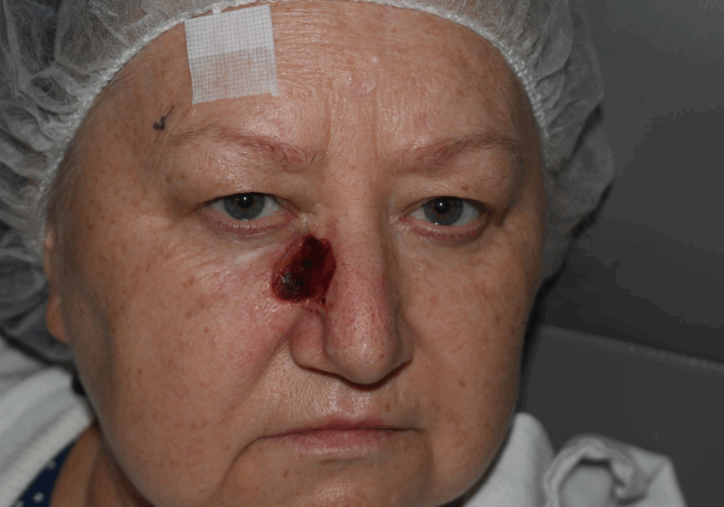 Procedure: Reconstruction of Right Malar Region and Nasal Sidewall via adjacent tissue transfer with myelolabial hatchet style flap